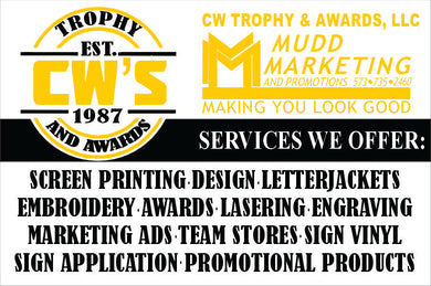 We are a full engravable shop. From plaques, medals, and tropies we are able to complete all your custom needs. We are also able to engrave cups, koozies, hat patches, and any other need that may arise. Please contact us at 573- 735-2460.